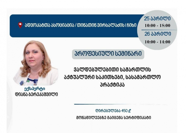 სემინარი ჩატარდება 2026 წლის 25 აპრილს, 10:00 საათიდან - 18:00 საათამდე და 26 აპრილს, 10:00 საათიდან - 14:00 საათამდე, ადვოკატთა ასოციაციის ოფისში (მისამართი: თინათინ ვირსალაძის I ჩიხი N1, დიღომი).